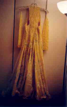 Description:.....Gorgeous Amerimcan Smooth gown with a modern and stylish look. Sleeveless bodice and long gloves are yellow lace covered with SS20 AB stones. Dramatic huge skirt made of light weight floral chiffon decorated with SS20 AB stones. Lining of the skirt is yellow. Can lift both sides of skirt above the head. Very flamboyant and extremely attractive on the floor. A lively and youthful look. Suitable for professional American style competitor or a serious amateur, 5'6" or above. Photo available.